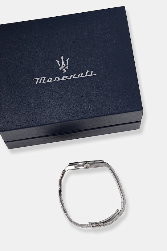 Часы из коллекции Maserati. Модель имеет овальный циферблат и сегментированный браслет. - Водонепроницаемость: WR. 50M (5ATM) - устойчив к брызгам, плаванию на поверхности. - Механизм: кварцевый, питание от батареек. - Стекло: минеральное (закаленное, очень устойчивое к ударам, трудно царапается). - Материал корпуса и браслета: сталь. - Модель упакована в фирменную коробку. - Толщина корпуса: 5 мм. - Ширина ремешка: 20 мм. - Диаметр корпуса: 40 мм.
