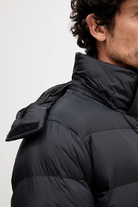- Высокий воротник и съемный капюшон обеспечивают дополнительную защиту от холода.