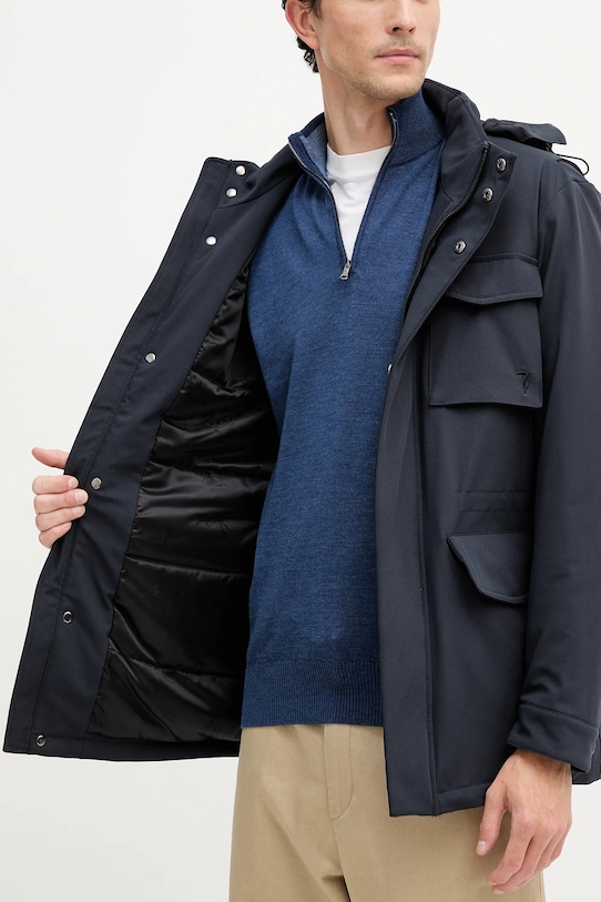 Эта куртка из коллекции Trussardi с легкой подкладкой изготовлена из гладкой ткани с синтетическим утеплителем для дополнительного комфорта в прохладную погоду. - Застежка-молния и кнопки. - Карманы на молнии. - Высокий воротник и съемный капюшон обеспечивают дополнительную защиту от холода. - Регулируемая талия со шнурками для индивидуальной посадки. - Длина: 82 см. - Ширина под мышками: 55 см. - Размеры указаны для размера: 48.