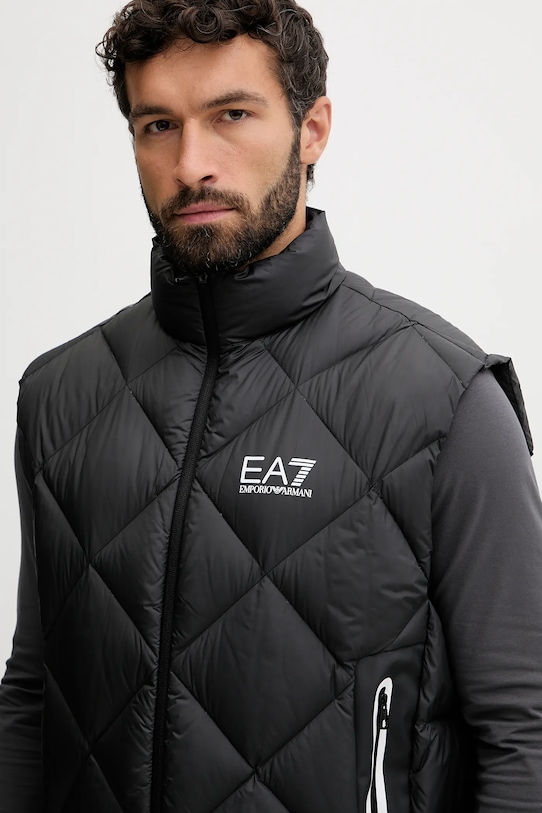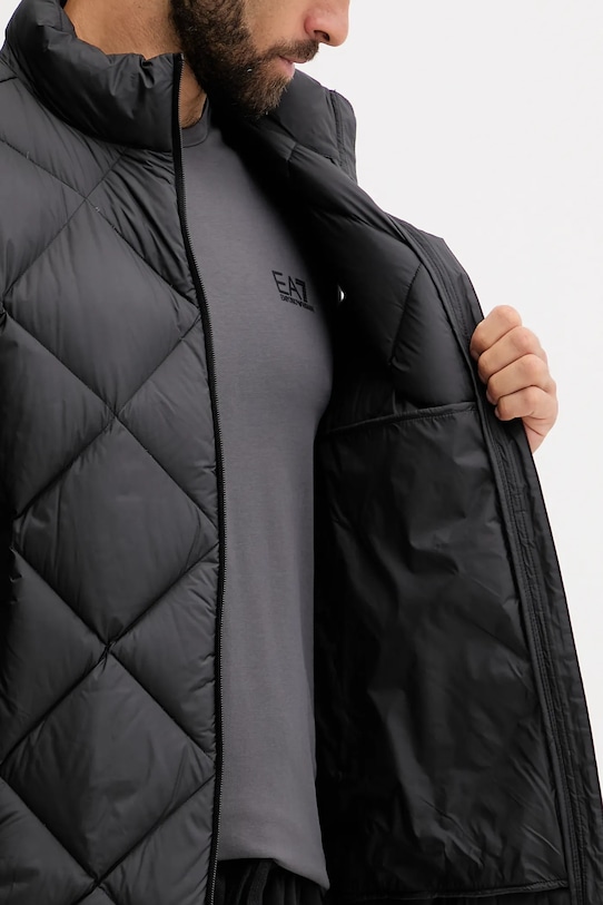 Этот пуховый жилет из коллекции EA7 Emporio Armani утеплён и выполнен из гладкой ткани. Стёганая конструкция с наполнителем из натурального пуха гарантирует высокий уровень защиты от холода. - Простой дизайн, не стесняющий движений. - Поднятый воротник обеспечивает дополнительную защиту от холода. - Молния по всей длине с внутренней ветрозащитной планкой. - Два прорезных боковых кармана на молнии. - Нижний край отделан завязками, обеспечивающими индивидуальную посадку. - Длина: 75 см. - Ширина под мышками: 61 см. - Размеры указаны для размера: L.