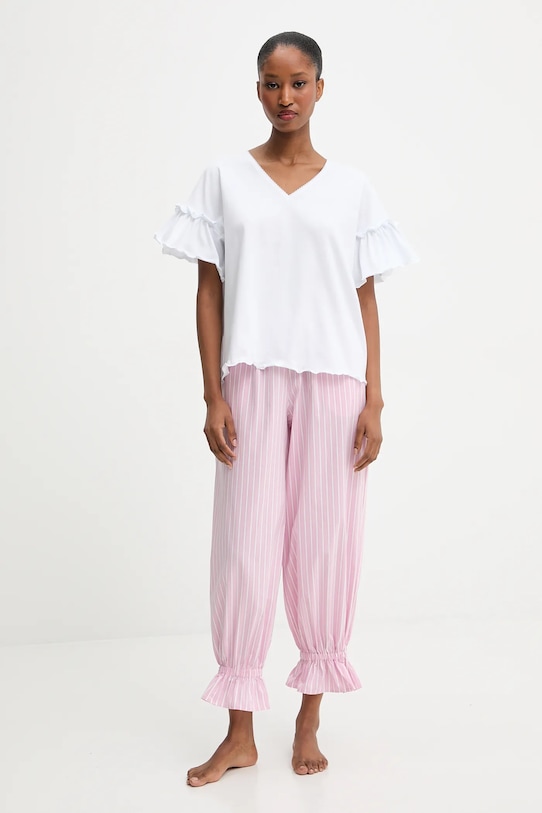 Пижама из коллекции Answear.LAB. Изготовлена из кружева. - Свободный крой, обеспечивающий полную свободу движений. - Острый вырез. - Эластичный пояс. - Два боковых накладных кармана. - Ширина под мышками: 55 см. - Длина: 55 см. - Ширина талии: 34 см. - Ширина бедер: 57 см. - Высота талии: 30 см. - Ширина штанины внизу: 14 см. - Длина по внутреннему шву: 66 см. - Размеры указаны для размера: S.