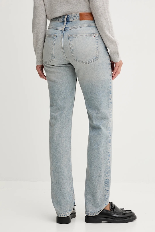 Классические прямые джинсы из коллекции Tommy Hilfiger с высокой талией. Изготовлены из плотного денима. - Модель с высокой талией, застежкой на пуговицы и молнию. - Три накладных кармана спереди. - Два накладных кармана на ягодицах. - Декоративно выстиранный деним. - Ширина талии: 36 см. - Ширина бедер: 46 см. - Высота талии: 26 см. - Ширина штанины внизу: 16 см. - Ширина штанины: 26 см. - Длина штанины: 107 см. - Размеры указаны для размера: 27/32.