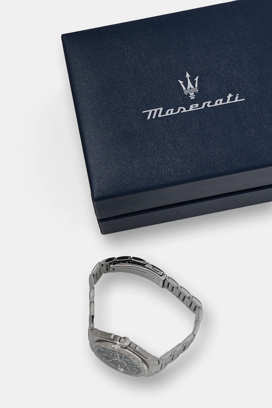 Часы из коллекции Maserati. Модель имеет круглый циферблат и сегментированный браслет. - Механизм: кварцевый, питание от батареек. - Стекло: минеральное (закаленное, очень устойчивое к ударам, трудно царапается). - Водонепроницаемость: WR. 50M (5ATM) - устойчив к брызгам, плаванию на поверхности. - Имеются хронограф и указатель даты. - Тахиметр. На безеле часов нанесена специальная шкала, которая в сочетании с секундной стрелкой позволяет рассчитать среднюю скорость. - Модель упакована в фирменную коробку. - Ширина ремешка: 25 мм. - Толщина корпуса: 5 мм. - Диаметр корпуса: 41 мм.