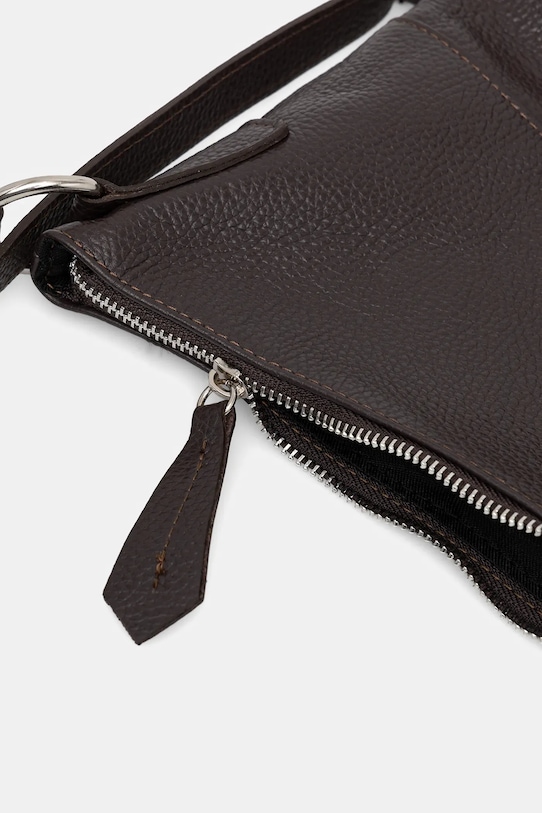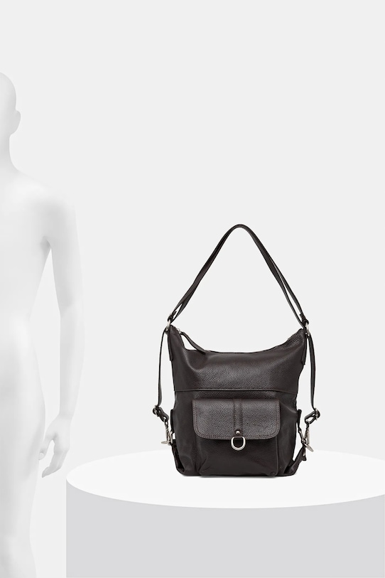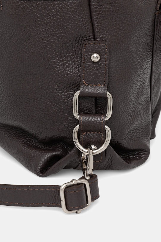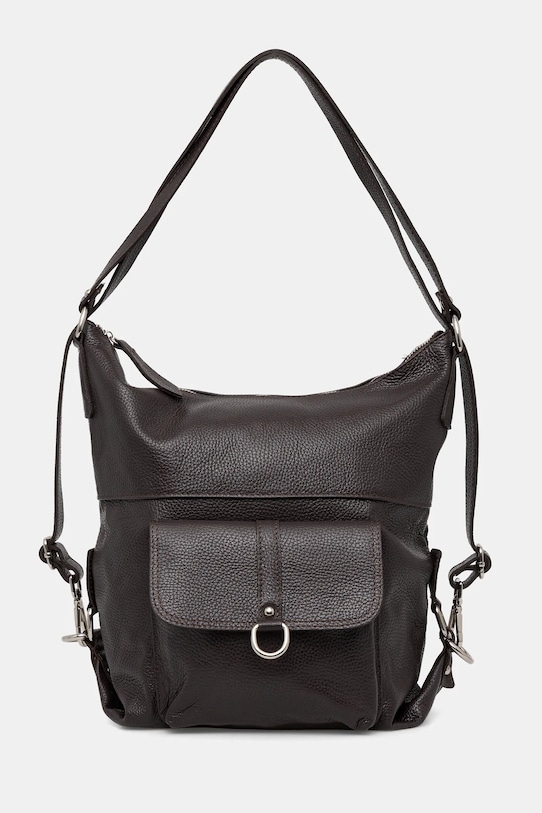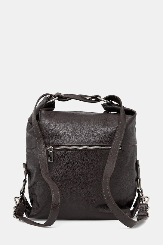 Рюкзак из коллекции Answear.Lab. Изготовлен из натуральной кожи. - Застежка-молния. - В зависимости от способа застегивания ремней, ее можно носить как сумочку или как рюкзак. - Передний карман с магнитной застежкой. - Имеет внутренние карманы. - Вмещает формат А4. - Модель без подкладки. - Входящий в комплект тканевый чехол защищает изделие от пыли. - Глубина: 11 см. - Высота: 32 см. - Ширина у основания: 25 см.