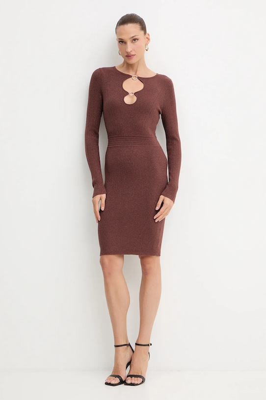 Это платье из коллекции Fracomina выполнено из эластичного трикотажа с рисунком. Модель выполнена из дышащего материала с высоким содержанием вискозы. - Приталенный крой, подчеркивающий силуэт. - Классический круглый вырез. - Длинные, прилегающие рукава. - Декоративные вырезы на горловине. - Модель без застежки. - Материал с металлической нитью. - Модель без подкладки. - Длина рукава: 63 см. - Длина: 100 см. - Ширина под мышками: 44 см. - Размеры указаны для размера: S.