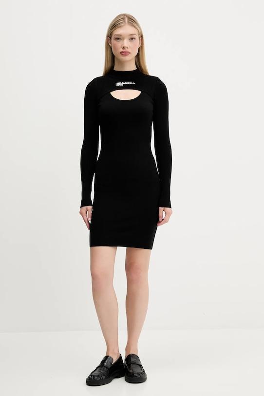 Это платье из коллекции Karl Lagerfeld Jeans выполнено из эластичного трикотажа. Модель выполнена из исключительно комфортного материала с высоким содержанием вискозы. - Приталенный крой, подчеркивающий силуэт. - Модель с водолазкой. - Декоративный вырез на горловине. - Длинные, прилегающие рукава. - Модель без застежки. - Модель без подкладки. - Ребристая структура материала делает его чрезвычайно гибким и идеально прилегает к телу. - Длина рукава: 65 см. - Длина: 91 см. - Ширина под мышками: 37 см. - Ширина талии: 31 см. - Ширина бедер: 33,5 см. - Размеры указаны для размера: S.