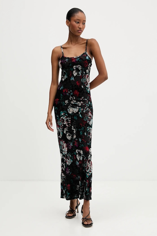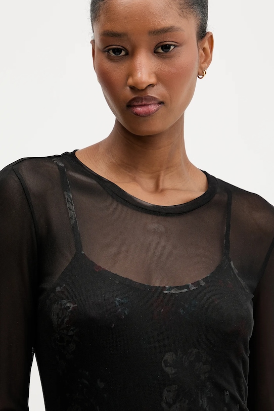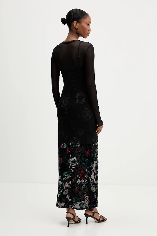 Это платье из коллекции Desigual выполнено из тонкого эластичного трикотажа. Оно имеет длинный рукав, который можно носить отдельно. - Приталенный крой, подчеркивающий силуэт. - Классический круглый вырез. - Регулируемые, несъемные лямки. - Модель с бархатными вставками. - Длина: 133 см. - Ширина под мышками: 40 см. - Ширина талии: 34 см. - Ширина бедер: 41 см. - Размеры указаны для размера: S.