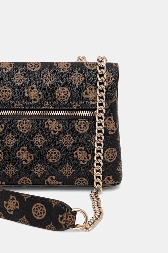 Небольшая сумочка из коллекции Guess. Модель на молнии, выполнена из экокожи. - Входящий в комплект тканевый чехол защищает изделие от пыли. - Клапан застегивается на магнит. - Модель на подкладке. - Не подходит для формата А4. - Имеет три отделения: два открытых и одно на молнии. - Отделения для карт. - Внутренний карман на молнии. - Карман на молнии на задней стороне позволяет безопасно хранить телефон или другие мелкие предметы. - Несъемный, регулируемый ремешок. - Глубина: 7 см. - Высота: 16 см. - Ширина у основания: 24 см.