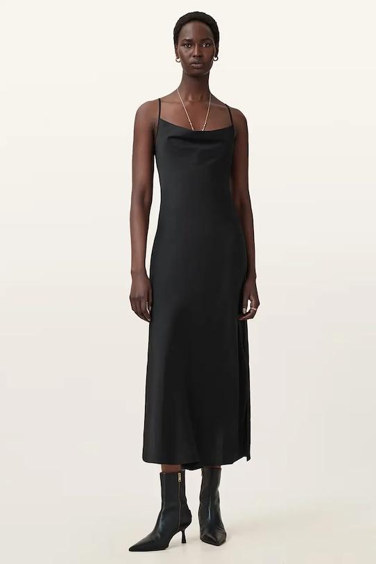 Это платье из коллекции AllSaints выполнено из гладкой ткани. Полиэстер обеспечивает повышенную устойчивость к сминанию. - Данное изделие частично изготовлено из переработанного полиэстера. - Приталенный крой, подчеркивающий силуэт. - Эффектный вырез цвета морской волны. - Регулируемые бретели обеспечивают оптимальную поддержку груди и позволяют индивидуально подогнать по фигуре, не раздражая кожу на плечах. - У него есть щель. - Сатиновая отделка.