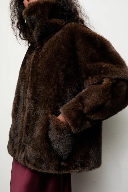 Куртка из коллекции Answear.Lab. Модель без подкладки выполнена из искусственного меха. Мягкий и приятный на ощупь материал. - Свободный крой, обеспечивающий полную свободу движений. - Длинный рукав. - Крой рукава со спущенной линией плеча не ограничивает подвижность. - Поднятый воротник обеспечивает дополнительную защиту от холода. - Удобная застежка-молния позволяет легко надевать и снимать. - Нижний край отделан завязками, позволяющими индивидуально регулировать размер. - Два накладных кармана спереди. - Длина рукава (от воротника): 72 см, - Длина: 62 см. - Ширина под мышками: 66 см. - Указаны размеры: S/M.