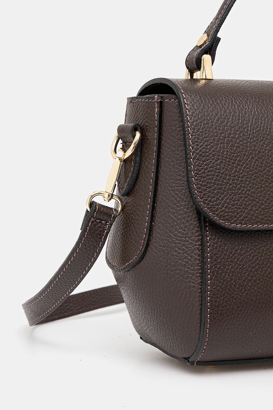 Небольшая сумочка из коллекции Answear.Lab. Изготовлена из натуральной кожи, с застёжкой. - Не подходит для формата А4. - Входящий в комплект тканевый чехол защищает изделие от пыли. - Застежка-молния. - Клапан застегивается на кнопку. - Имеет три отделения: два открытых и одно на молнии. - Имеет внутренние карманы, в том числе один на молнии. - Модель оснащена металлическими ножками, которые защищают дно сумки. - Имеет ручку и съемный регулируемый ремень. - Глубина: 8 см. - Высота: 18 см. - Ширина у основания: 20,5 см. - Длина ручки: 27 см. - Минимальная длина ремешка: 65 см. - Максимальная длина ремня: 112 см.
