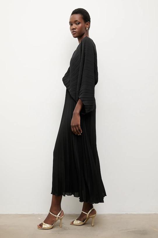 Это платье из коллекции Answear.LAB выполнено из тонкой, неэластичной ткани. Полиэстер обеспечивает лучшую устойчивость к сминанию. - Расклешенный крой. - Классический круглый вырез. - Декоративный вырез на горловине. - Плиссированный материал. - Застегивается на пуговицы сзади. - Модель на подкладке. - Узкий эластичный пояс. - Длина: 140 см. - Ширина под мышками: 43 см. - Ширина талии: 25 см. - Размеры указаны для размера: S.