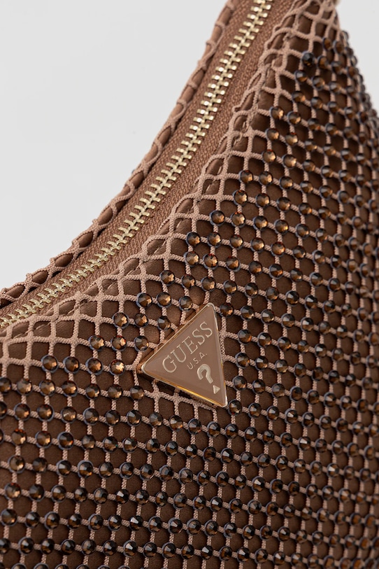 Небольшая сумочка из коллекции Guess. Эта модель с застёжкой-пряжкой выполнена из комбинации текстиля и синтетических материалов. Эффектный аксессуар для особых случаев. - Входящий в комплект тканевый чехол защищает изделие от пыли. - Отделение на молнии. - Имеет внутренний карман на молнии и отделения для карт. - Усиленное дно сумки позволяет изделию долго сохранять форму. - Модель оснащена металлическими ножками, которые защищают дно сумки. - Сумка для ношения в руке или на плече. - Несъемный, нерегулируемый ремешок. - Не подходит для формата А4. - Модель на подкладке. - Количество слотов для карт: 3. - Количество внутренних карманов на молнии: 1. - Длина ремешка: 54 см. - Глубина: 7 см. - Высота: 16 см. - Ширина у основания: 21 см.