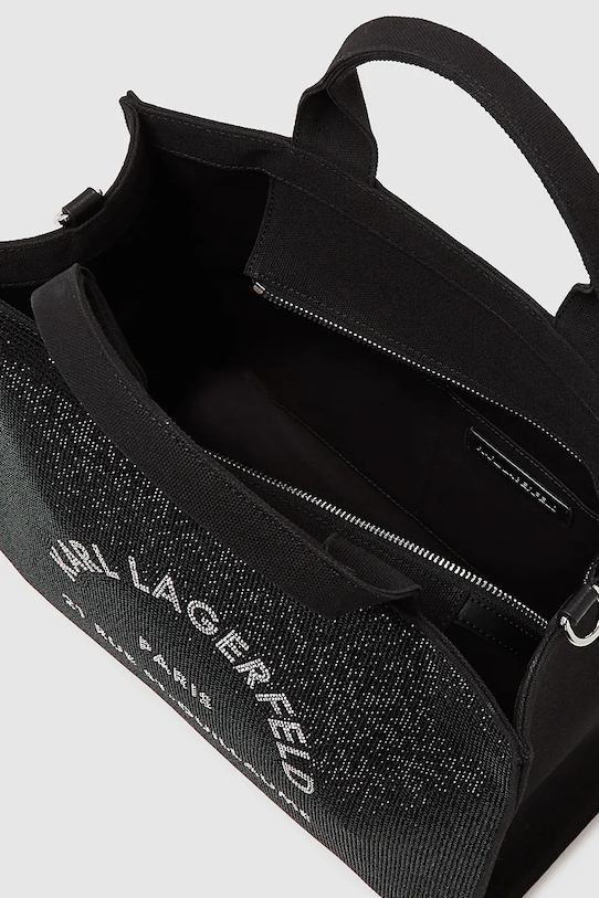 Сумка среднего размера из коллекции Karl Lagerfeld. Модель с застёжкой выполнена из комбинации текстиля и синтетических материалов. - Модель частично изготовлена из переработанного хлопка. - Отделение на молнии. - Внутренний накладной карман для удобного и безопасного хранения телефона и других мелких предметов. - Не подходит для формата А4. - Короткие ручки для удобной переноски в руке или на плече. - Съемный регулируемый ремешок. - Глубина: 15 см. - Высота: 25,5 см. - Ширина у основания: 33,5 см.