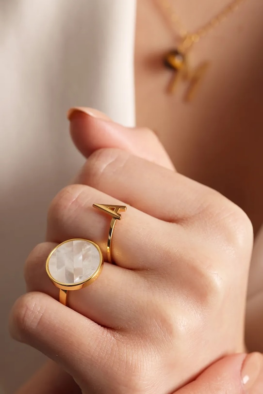 Кольцо из коллекции Design Letters. Это кольцо с перламутровым украшением изготовлено из серебра 925 пробы, покрытого 18-каратным золотом.