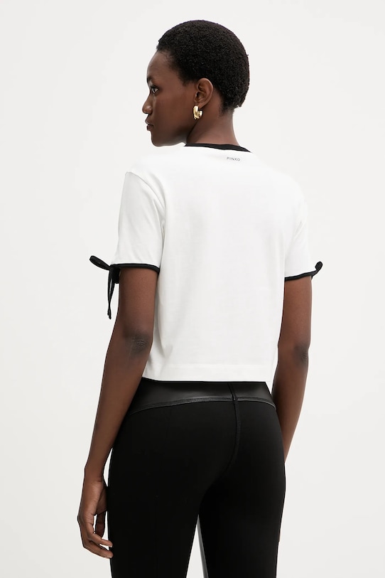 Футболка из коллекции Pinko выполнена из тонкой, эластичной ткани. Модель выполнена из исключительно комфортного хлопкового материала. - Простой дизайн, не стесняющий движений. - Классический круглый вырез. - Модель с декоративными завязками. - Модель с декоративной вышивкой. - Длина: 47 см. - Ширина под мышками: 46,5 см. - Размеры указаны для размера: S.