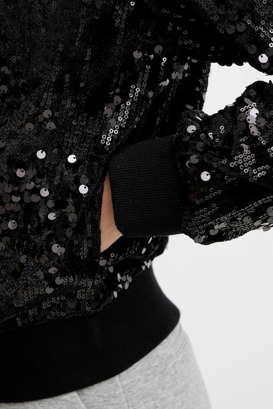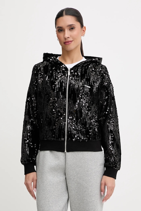 Толстовка с капюшоном из коллекции Guess, выполненная из трикотажного полотна с аппликацией. Эффектный, блестящий материал. - Простой дизайн, не стесняющий движений. - Удобная застежка-молния позволяет легко надевать и снимать. - Рукава и низ изделия отделаны удобными эластичными манжетами. - Внешние накладные карманы. - Модель на подкладке. - Модель выполнена из ткани с пайетками. - Длина рукава: 60 см. - Длина: 51 см. - Ширина под мышками: 50 см. - Размеры указаны для размера: S.