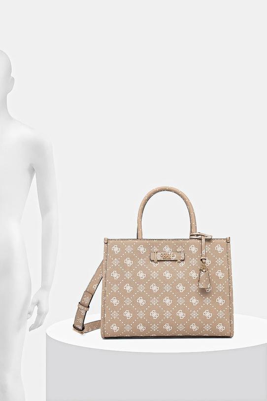 Сумка среднего размера из коллекции Guess. Модель на молнии, выполнена из экокожи. - Содержит переработанный пластик. - Застежка-молния. - Модель на подкладке. - Не подходит для формата А4. - Три внутренних кармана: один на молнии, два накладных. - Карман на молнии на задней стороне позволяет безопасно хранить телефон или другие мелкие предметы. - Внешний накладной карман. - Сумка для ношения в руке или на плече. - Имеет ручки и съемный регулируемый ремень. - Модель оснащена металлическими ножками, которые защищают дно сумки. - Входящий в комплект тканевый чехол защищает изделие от пыли. - Минимальная длина ремешка: 97 см. - Максимальная длина ремня: 115 см. - Длина ручки: 40 см. - Глубина: 14 см. - Высота: 27 см. - Ширина у основания: 34 см.