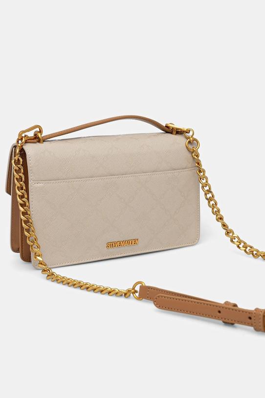 Небольшая сумочка из коллекции Стива Мэддена. Застёгивается на молнию, выполнена из экокожи. - Отделение застегивается на кнопку. - Имеет три отделения, одно из которых застегивается на молнию. - Три внутренних кармана: один на молнии, два накладных. - Накладной карман на спинке позволяет безопасно хранить мелкие предметы. - Модель на подкладке. - Не подходит для формата А4. - Имеет ручку и съемный регулируемый ремень. - Входящий в комплект тканевый чехол защищает изделие от пыли. - Глубина: 8,5 см. - Высота: 15,5 см. - Ширина у основания: 25,5 см. - Минимальная длина ремня: 110 см. - Максимальная длина ремня: 127 см. - Длина ручки: 21,5 см.