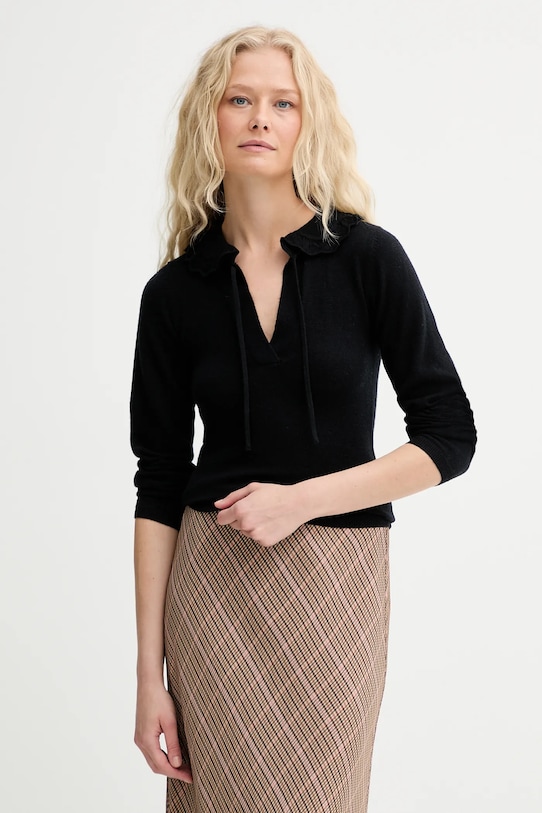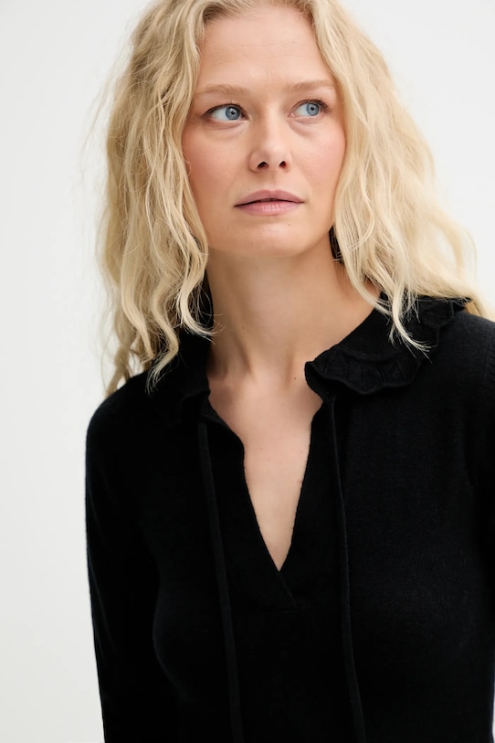 Этот свитер из коллекции MUNTHE связан из тонкой шерстяной пряжи. Шерсть обладает естественными дышащими и терморегулирующими свойствами. - Этот облегающий свитер плотно облегает тело и естественно подчёркивает силуэт. Подходит как для элегантных, так и для повседневных образов. - Острый вырез с завязками. - Модель с декоративной оборкой. - Длина: 58 см. - Ширина под мышками: 37 см. - Длина рукава: 61 см. - Размеры указаны для размера: 36.