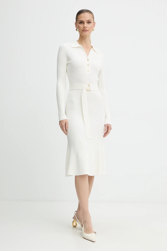 Это платье из коллекции Marciano Guess выполнено из гладкой, эластичной ткани. Модель выполнена из дышащего материала с высоким содержанием вискозы. - Расклешенный крой. - Модель без подкладки. - Декоративный, заостренный вырез. - Модель с мягким воротником. - Застежка на короткие пуговицы обеспечивает эффективную вентиляцию и легкость надевания и снимания. - Длинные, прилегающие рукава. - Пояс на талии корректирует фигуру и еще больше подчеркивает талию. - Ребристая структура материала делает его чрезвычайно гибким и идеально прилегает к телу. - Длина рукава: 64 см. - Длина: 114 см. - Ширина под мышками: 38 см. - Размеры указаны для размера: 36.