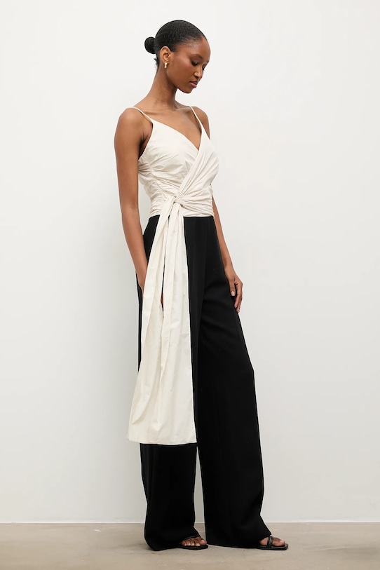 Комбинезон из коллекции Answear.LAB, выполненный из комбинации различных материалов. - Простой дизайн, не стесняющий движений. - Модель с декоративными оборками. - Острый вырез. - Застежка-молния сзади. - Модель без бретелек. - Ширина талии: 36 см. - Ширина бедер: 56 см. - Высота талии: 28 см. - Ширина штанины внизу: 30 см. - Ширина штанины: 31 см. - Длина по внутреннему шву: 83 см. - Ширина под мышками: 44 см. - Размеры указаны для размера: S.