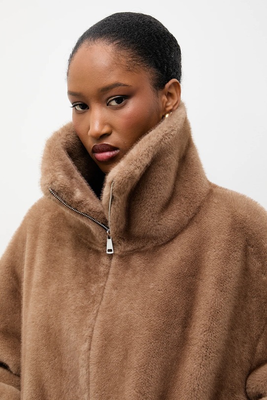 Куртка из коллекции Answear.Lab. Модель без подкладки выполнена из искусственного меха. Мягкий и приятный на ощупь материал. - Свободный крой, обеспечивающий полную свободу движений. - Длинный рукав. - Крой рукава со спущенной линией плеча не ограничивает подвижность. - Поднятый воротник обеспечивает дополнительную защиту от холода. - Удобная застежка-молния позволяет легко надевать и снимать. - Нижний край отделан завязками, позволяющими индивидуально регулировать размер. - Два накладных кармана спереди. - Длина рукава (от воротника): 72 см, - Длина: 62 см. - Ширина под мышками: 66 см. - Указаны размеры: S/M.
