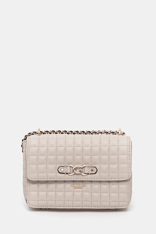 Небольшая сумочка из коллекции Guess. Модель на молнии, выполнена из экокожи. - Не подходит для формата А4. - Входящий в комплект тканевый чехол защищает изделие от пыли. - Клапан застегивается на магнит. - Имеет три отделения, одно из которых застегивается на молнию. - Внутренний карман на молнии. - Модель оснащена металлическими ножками, которые защищают дно сумки. - Цепь прикреплена постоянно. - Высота: 15 см. - Глубина: 7,5 см. - Ширина у основания: 22 см.