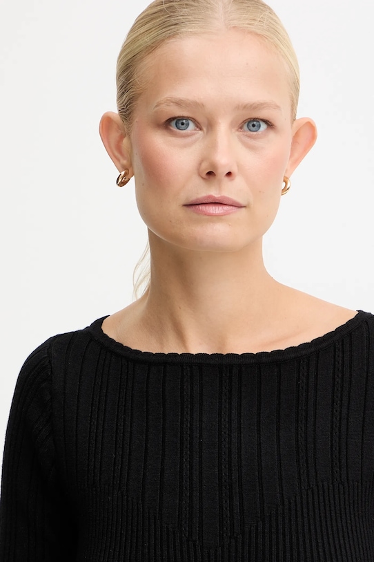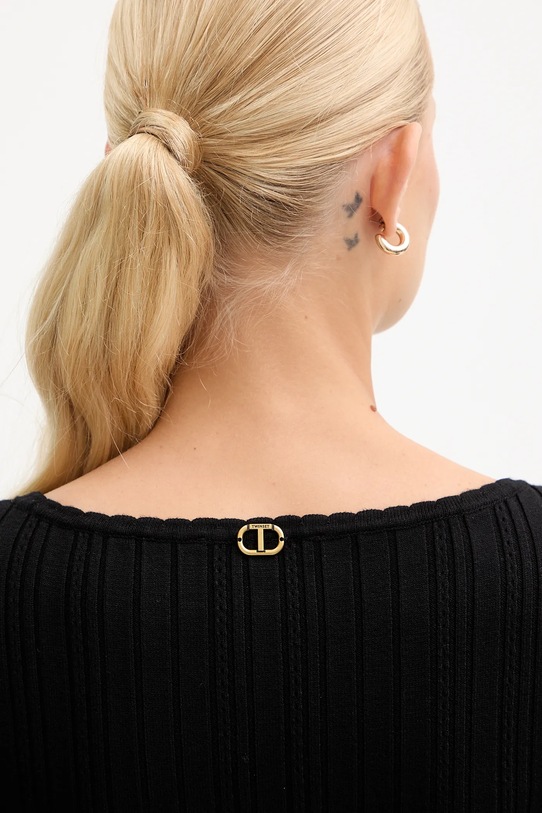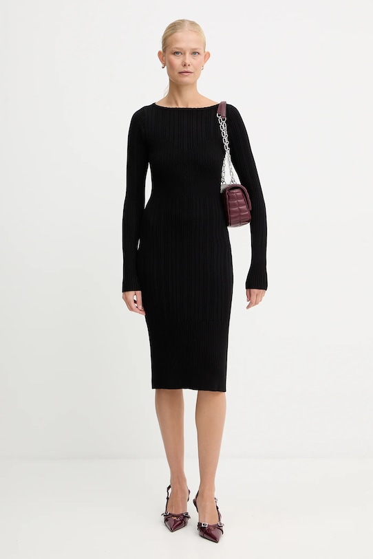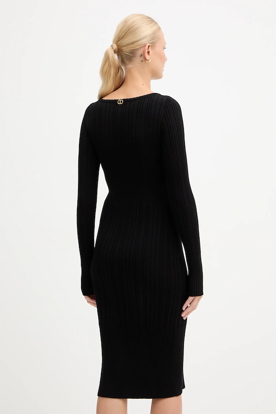 Это платье из коллекции Twinset выполнено из тонкого, эластичного трикотажа. Модель выполнена из исключительно комфортного материала с высоким содержанием вискозы. - Приталенный крой, подчеркивающий силуэт. - Вырез горловины «лодочка». - Модель выполнена из трикотажного полотна в рубчик. - Длина рукава: 62 см. - Длина: 99 см. - Ширина под мышками: 31 см. - Ширина талии: 26 см. - Ширина бедер: 28 см. - Размеры указаны для размера: S.