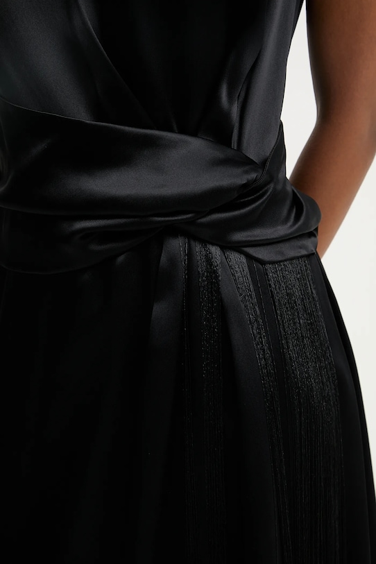 Это платье из коллекции Answear.LAB выполнено из гладкого материала. Его крой отличается тонкой, струящейся тканью. - Расклешенный крой. - Круглый вырез. - Потайная застежка-молния сзади. - Декоративный разрез спереди. - Эластичная вставка обеспечивает индивидуальную посадку. - В плечах вшиты подкладки. - Модель с декоративной бахромой. - Длина платья: 130 см. - Ширина под мышками: 44 см. - Размеры указаны для размера: S.