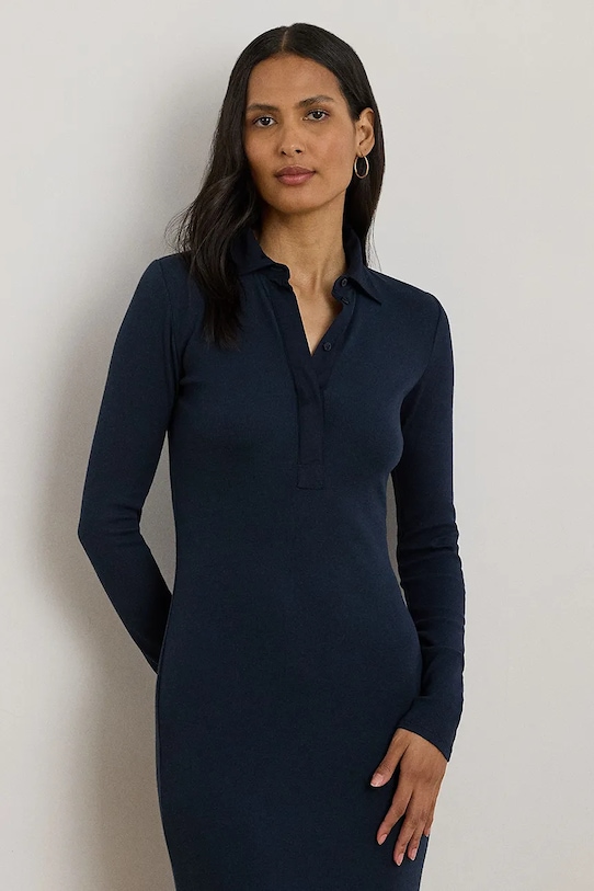 Платье из коллекции Lauren Ralph Lauren, выполненное из гладкого, эластичного трикотажа. Благодаря содержанию модала, ткань мягкая на ощупь и имеет приятную для кожи текстуру. - Продукт из серии «Инвестирование в Better Cotton». Better Cotton - ведущая в мире инициатива по устойчивому развитию хлопка, миссия которой - помочь хлопковым общинам выживать и процветать, одновременно защищая и восстанавливая окружающую среду. - Приталенный крой, подчеркивающий силуэт. - Модель с мягким воротником. - Длинные, прилегающие рукава. - Застежка на короткие пуговицы обеспечивает эффективную вентиляцию и легкость надевания и снимания. - Модель без подкладки. - Ребристая структура материала делает его чрезвычайно гибким и идеально прилегает к телу.