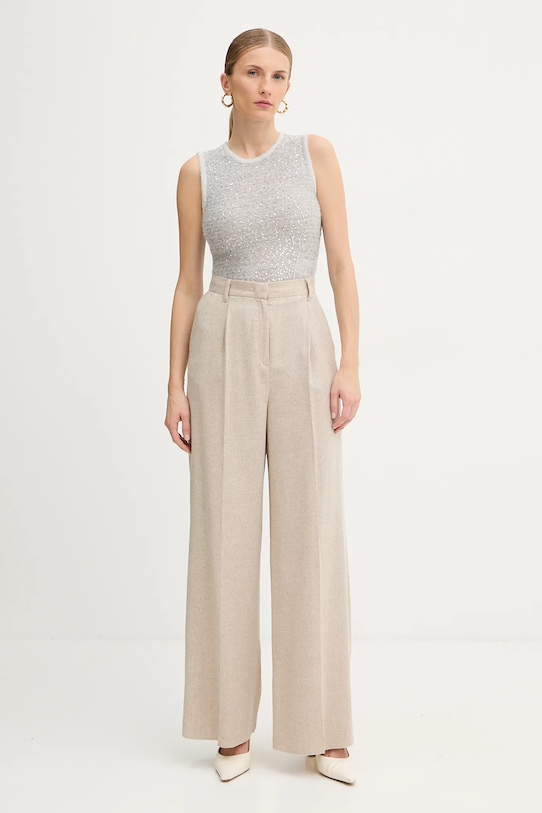 Брюки из коллекции Marella из меланжевой ткани. Натуральная шерсть легче традиционной и отличается исключительной мягкостью, нежностью и прочностью. - Свободная нога. - Застежка на молнию, пуговицы и крючок. - Два боковых накладных кармана. - Штанина отутюживается в складку. - Тонкая, неэластичная ткань. - Ширина талии: 34 см. - Ширина бедер: 52 см. - Высота талии: 35 см. - Ширина штанины внизу: 32 см. - Ширина штанины: 33 см. - Длина по внутреннему шву: 81 см. - Размеры указаны для размера: 36.