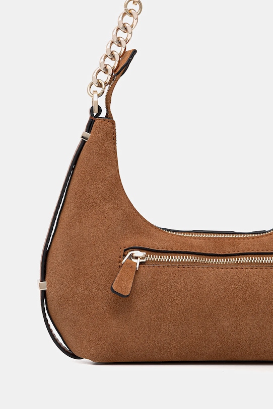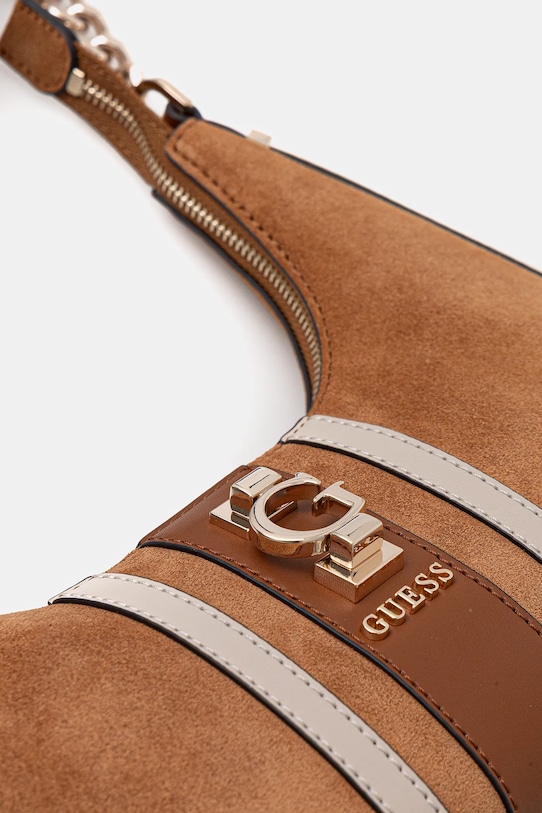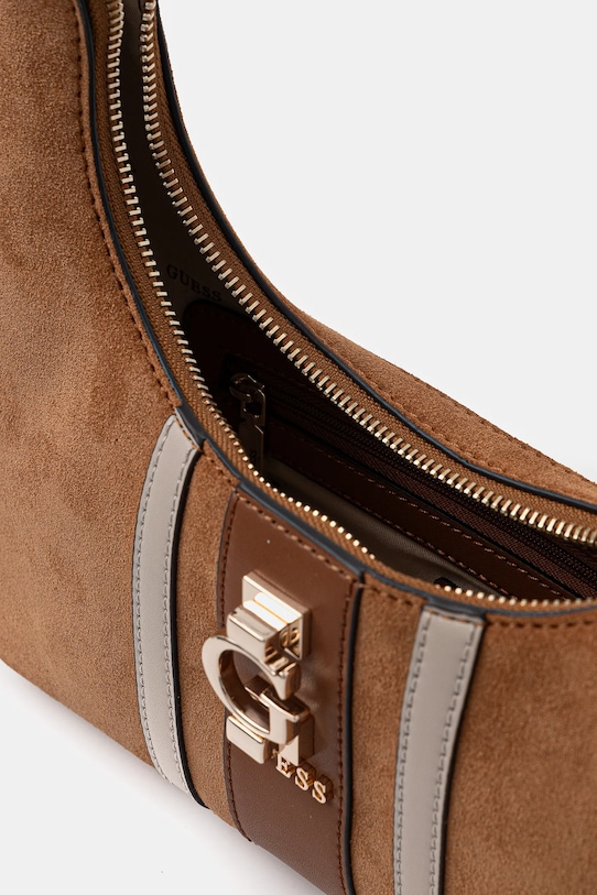 Небольшая сумочка из коллекции Guess. Застегивается на молнию, выполнена из замши. - Застежка-молния. - Короткая ручка для удобной переноски в руке или на плече. - Внутренний карман на молнии позволяет хранить самые необходимые вещи. - Количество слотов для карт: 3. - Карман на молнии сзади. - Не подходит для формата А4. - Модель на подкладке. - Входящий в комплект тканевый чехол защищает изделие от пыли. - Длина ручки: 46 см. - Глубина: 5 см. - Высота: 12 см. - Ширина у основания: 22 см.