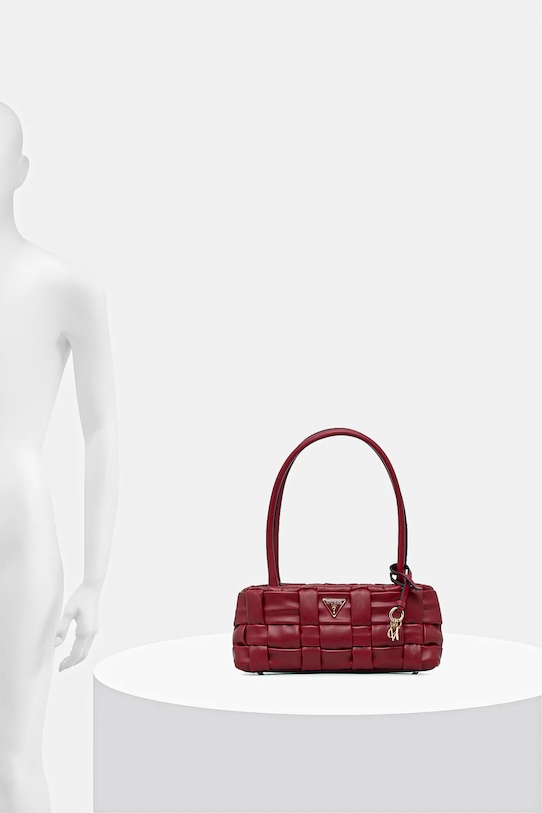 Небольшая сумочка из коллекции Guess. Изготовлена из экокожи, с застёжкой. - Входящий в комплект тканевый чехол защищает изделие от пыли. - Не подходит для формата А4. - Магнитная застежка. - Имеет три отделения, одно из которых застегивается на молнию. - Внутренние отделения для карт. - Длинные ручки для удобной переноски в руке или на плече. - Модель с декоративным кольцом для ключей. - Модель оснащена металлическими ножками, которые защищают дно сумки. - Глубина: 8 см. - Высота: 13 см. - Ширина у основания: 29,5 см. - Длина ручки: 60 см.