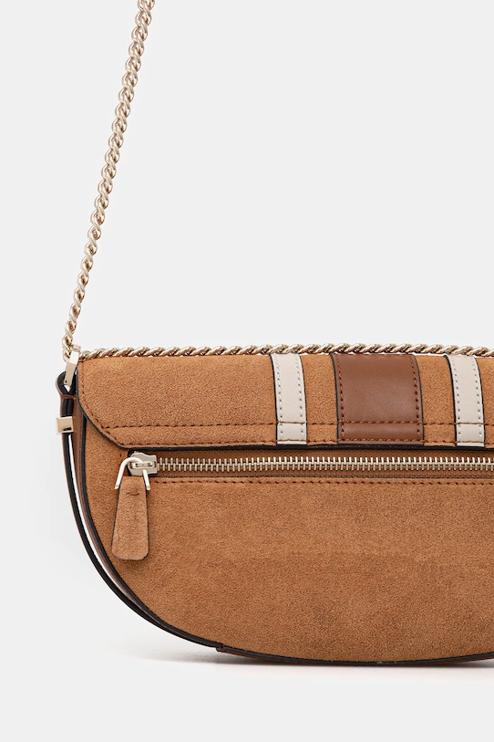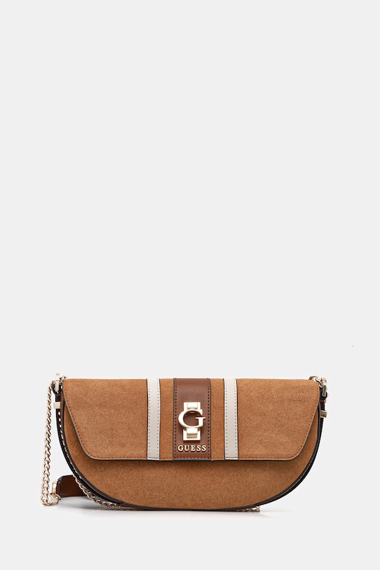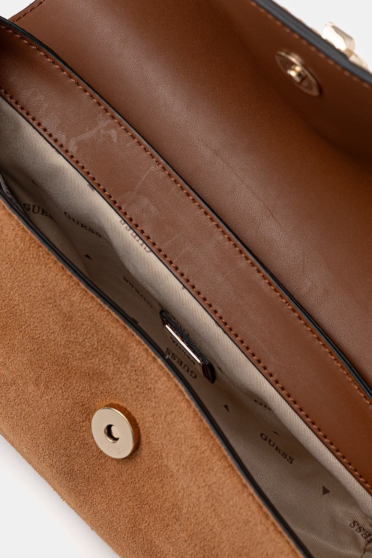 Небольшая сумочка из коллекции Guess. Модель на молнии выполнена из комбинации замши и натуральной кожи. - Клапан застегивается на магнит. - Модель на подкладке. - Не подходит для формата А4. - Имеет внутренние отделения для карт. - Сумка для ношения в руке или на плече. - Входящий в комплект тканевый чехол защищает изделие от пыли. - Количество слотов для карт: 3. - Глубина: 6,5 см. - Высота: 13,5 см. - Ширина у основания: 27 см.