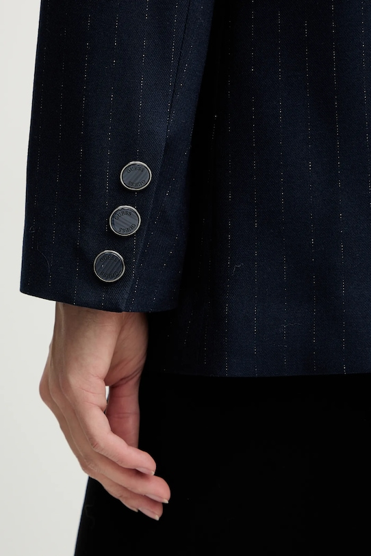Эта куртка из коллекции Guess изготовлена из полиэфирной ткани, которая обеспечивает большую устойчивость к сминанию. - Простой дизайн. - Модель на подкладке. - В плечах вшиты подкладки. - Двубортный пиджак с застежкой на пуговицы. - Модель с карманами, декорированными клапанами. - Материал с металлической нитью. - Длина: 73 см. - Длина рукава: 59 см. - Ширина под мышками: 43 см. - Ширина плеч: 37 см. - Размеры указаны для размера: S.
