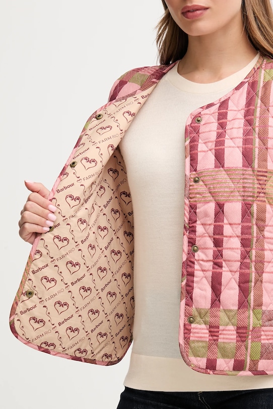 Жилет из коллекции Barbour. Эта модель с лёгкой подкладкой выполнена из ткани с узором. Утеплитель синтетический, обеспечивающий дополнительный комфорт в прохладную погоду. - Полиэстер, использованный при изготовлении этой модели, полностью переработан. - Простой дизайн, не стесняющий движений. - Застежка-кнопка по всей длине обеспечивает легкую и эффективную вентиляцию. - Два боковых накладных кармана. - Материал с декоративной строчкой. - Длина: 60 см. - Ширина под мышками: 50 см. - Ширина плеч: 36 см. - Размеры указаны для размера: S.
