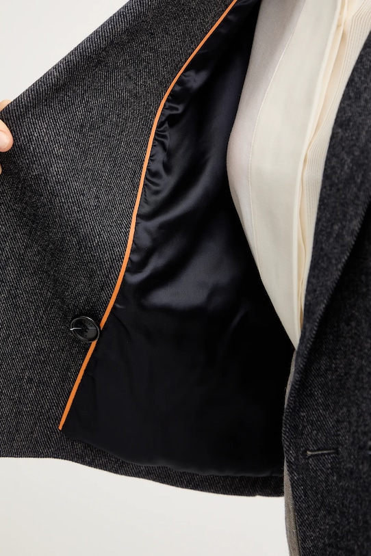Эта куртка BOSS Orange выполнена из ткани с узором. Высокие терморегулирующие свойства шерсти помогают согреться в холод и охладиться в жару. - Простой дизайн, не стесняющий движений. - Модель на подкладке. - Классические лацканы. - В плечах вшиты подкладки. - Двубортный пиджак с застежкой на пуговицы. - Два накладных кармана спереди. - Тонкая, неэластичная ткань. - Длина рукава: 59 см. - Длина: 53,5 см. - Ширина под мышками: 53 см. - Ширина плеч: 43 см. - Размеры указаны для размера: 36.