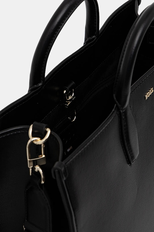 Большая сумка из коллекции BOSS. Застегивается на молнию, выполнена из экокожи. - Изделия линейки BETTER BOSS не менее чем на 60% изготовлены из материалов, полученных более экологичным способом. - Отделение застегивается на карабин. - Имеет ручки и съемный регулируемый ремень. - Вмещает формат А4. - Модель на подкладке. - Внутренний карман на молнии. - Модель оснащена металлическими ножками, которые защищают дно сумки. - Минимальная длина ремешка: 85 см. - Максимальная длина ремня: 137 см. - Длина ручки: 26 см. - Глубина: 14 см. - Высота: 27 см. - Ширина у основания: 36 см.