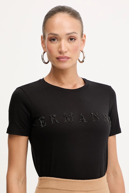 Футболка из коллекции ERMANNO Firenze, выполненная из тонкой, эластичной ткани. Эта модель выполнена из исключительно комфортного хлопкового материала. - Простой дизайн, не стесняющий движений. - Классический круглый вырез. - Модель с декоративной аппликацией из бисера и стразов. - Длина: 58 см. - Ширина под мышками: 47 см. - Размеры указаны для размера: 36.