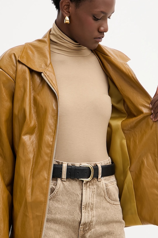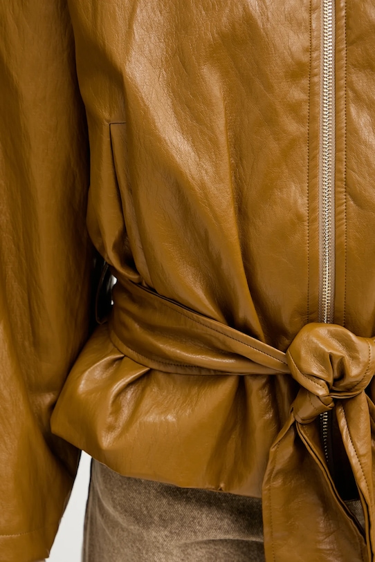 Куртка из коллекции Haveone. Модель без подкладки выполнена из экокожи. - Простой дизайн, не стесняющий движений. - Неутепленная модель с подкладкой. - Застежка-молния. - Модель с воротником. - Пояс на талии. - Накладные карманы. - В плечах вшиты подкладки. - Длина рукава: 54 см. - Длина: 61 см. - Ширина под мышками: 58 см. - Ширина плеч: 47 см. - Размеры указаны для размера: S.