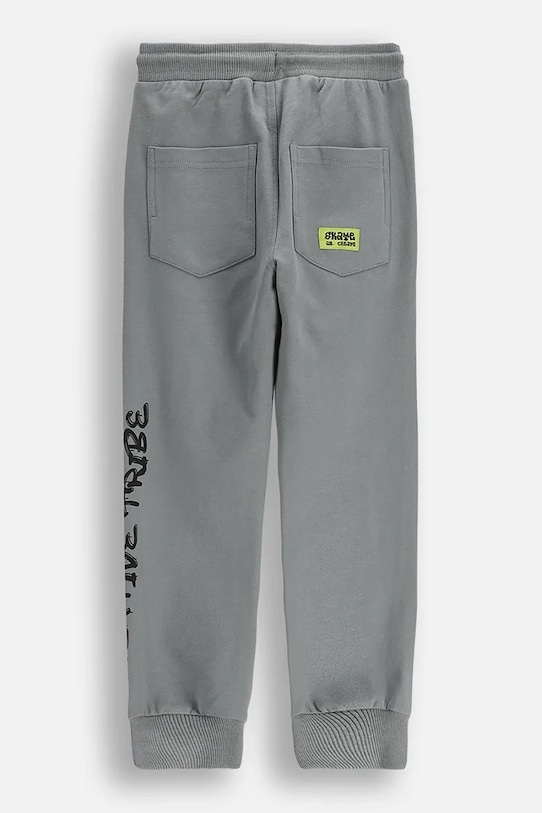 Детские брюки из коллекции Coccodrillo. Изготовлены из хлопкового трикотажа. - Продукция с сертификатом ECO 5 выдается продуктам, которые соответствуют ряду высоких требований, связанных с управлением производством. - Приталенный фасон. - Регулировка ширины талии с помощью шнурков. - Модель с накладными карманами. - Два накладных кармана на ягодицах. - Ножки отделаны манжетами. - Модель с принтом.