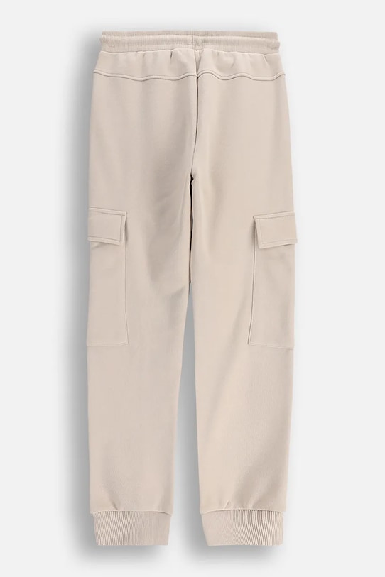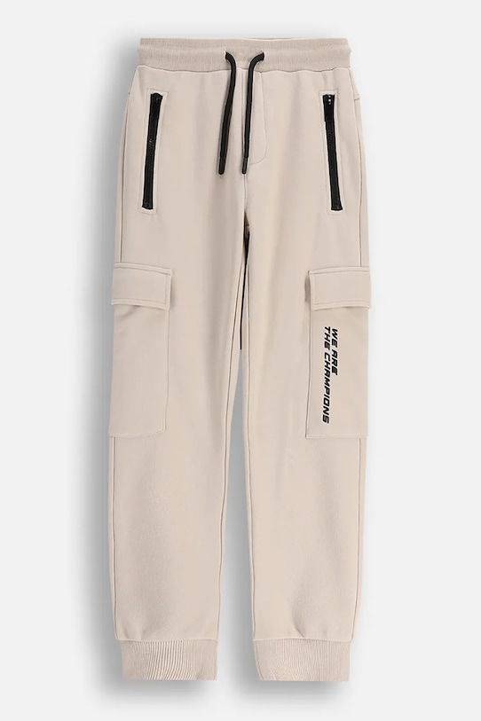 Детские брюки из коллекции Coccodrillo. Изготовлены из хлопкового трикотажа. - Продукция с сертификатом ECO 5 выдается продуктам, которые соответствуют ряду высоких требований, связанных с управлением производством. - Карманы для груза обеспечивают дополнительное место для хранения мелких предметов. - Два прорезных боковых кармана на молнии. - Регулировка ширины талии с помощью шнурков. - Ножки отделаны узкой эластичной манжетой. - Приталенный крой.