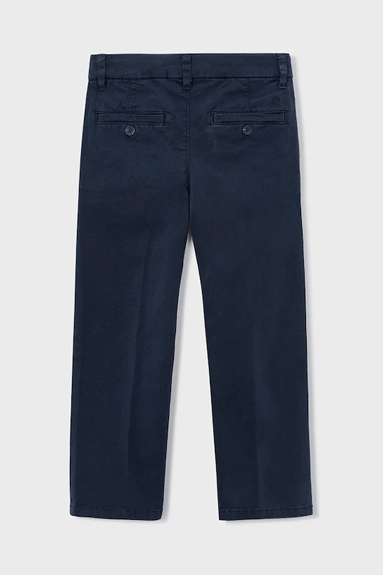 Детские брюки из коллекции Mayoral из тонкой, слегка эластичной ткани. Модель выполнена из исключительно комфортного материала с высоким содержанием хлопка. - Для производства использовался хлопок, полученный в результате экологически устойчивого производства, что обеспечивает минимально возможное потребление воды и экологически безопасное окрашивание. - Брюки слегка приталенные на бедрах. - Прямая нога полной длины. - Внутренняя регулировка ширины на талии. - Застежка на пуговицы. - Два боковых накладных кармана. - Два кармана на пуговицах на ягодицах.