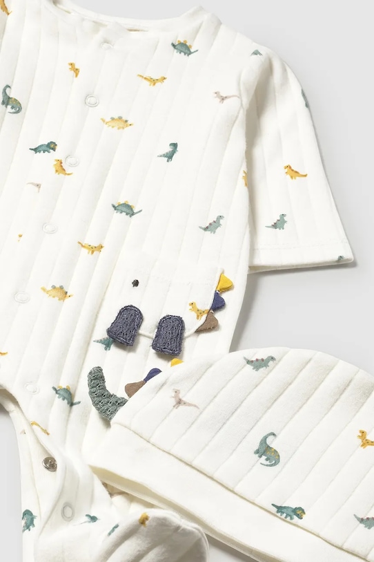 Детский комбинезон и шапочка из коллекции Mayoral Newborn. Изготовлены из трикотажного полотна. – Инициатива «Лучший хлопок». Изделия с этой маркировкой содержат не менее 50% хлопка от розничного продавца или бренда, участвующего в инициативе «Лучший хлопок» и инвестирующего в развитие BCI. - Приталенный крой. - Застежка-кнопка в области паха для полной функциональности.