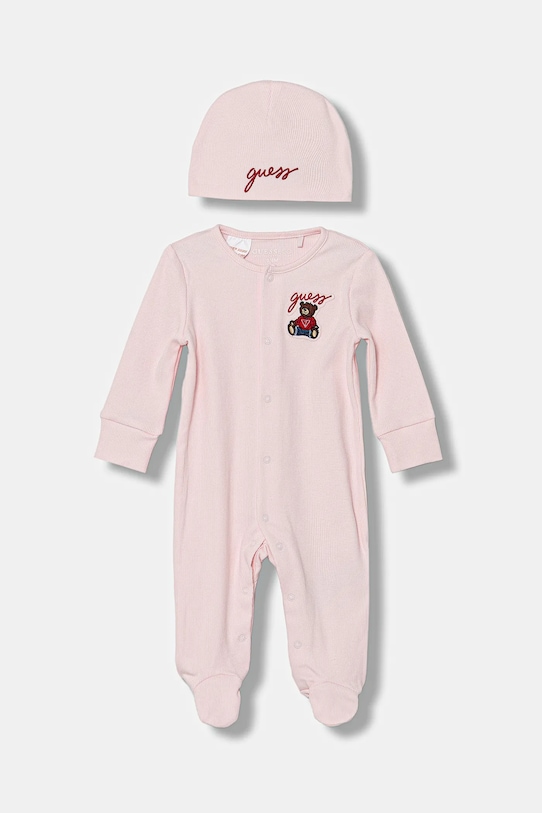 Детские пижамки из коллекции Guess. Изготовлены из тонкой эластичной ткани. В комплект входит шапочка. Этот продукт частично изготовлен из сертифицированного органического хлопка, выращенного и собранного с растений, не содержащих ГМО, без использования удобрений и пестицидов. Процесс производства органического хлопка более экологичен, а изделия из него полезнее для здоровья. - Удобная застежка-кнопка позволяет легко надевать и снимать. - Рукава отделаны удобными эластичными манжетами.