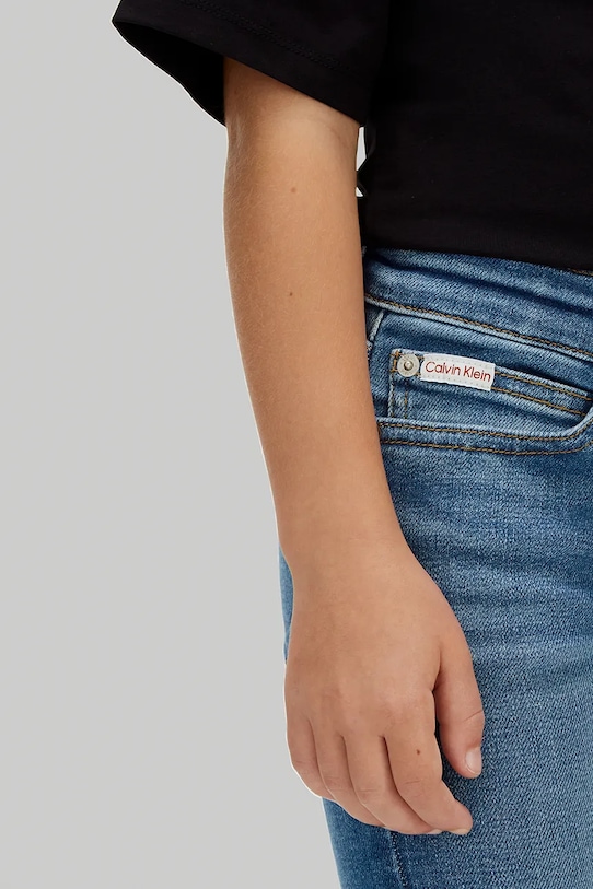 Эти детские джинсы Calvin Klein Jeans с высокой посадкой и расклешенным кроем изготовлены из стираного денима. – Инициатива «Лучший хлопок». Изделия с этой маркировкой содержат не менее 50% хлопка от розничного продавца или бренда, участвующего в инициативе «Лучший хлопок» и инвестирующего в развитие BCI. - Этот продукт частично изготовлен из переработанного хлопка. - Модель с высокой талией, застежкой на пуговицы и молнию. - Три накладных кармана спереди. - Два накладных кармана на ягодицах.
