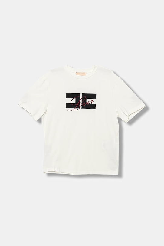 Детская футболка из коллекции Elisabetta Franchi выполнена из тонкой, эластичной ткани. Эта модель выполнена из исключительно комфортного и дышащего материала, идеально подходящего для теплого времени года. - Простой дизайн, не стесняющий движений. - Классический круглый вырез. - Короткий рукав. - Модель с принтом. - Длина: 58 см. - Ширина под мышками: 46 см. - Размеры указаны для высоты: 140 см.