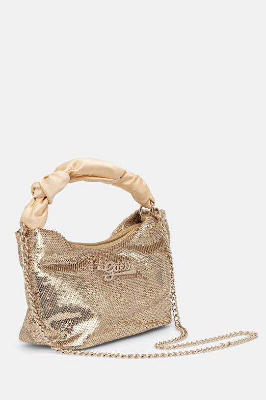 Маленькая детская сумочка из коллекции Guess. Модель на молнии, выполнена из ткани с пайетками. - Застежка-молния. - Имеет ручку и съемный нерегулируемый ремень. - Не подходит для формата А4. - Модель на подкладке. - Входящий в комплект тканевый чехол защищает изделие от пыли. - Внутренних карманов нет. - Длина ремешка: 90 см. - Длина ручки: 29 см. - Глубина: 10 см. - Высота: 14 см. - Ширина у основания: 18 см.