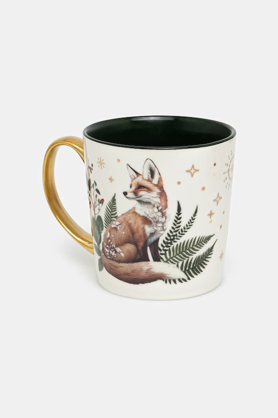 - Кружка украшена растительными и животными мотивами.